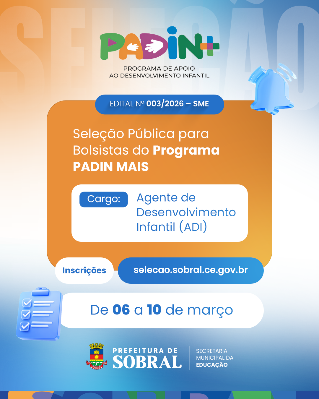 A Prefeitura de Sobral, por meio da Secretaria da Educação, abriu nesta sexta-feira (6/03) as inscrições para o processo seletivo destinado à formação de banco de bolsistas para atuação como Agentes de Desenvolvimento Infantil (ADI) no Programa de Apoio ao Desenvolvimento Infantil Mais (Padin Mais).