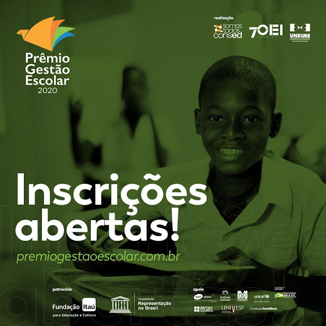 O Prêmio Gestão Escolar 2020 tem o patrocínio da Fundação Itaú para a Educação e Cultura e conta com a parceria da Bett Educar, British Council, Fundação Roberto Marinho, Fundação Santillana, Instituto Natura, Ministério da Educação, Unesco, Unicef e Univesp.