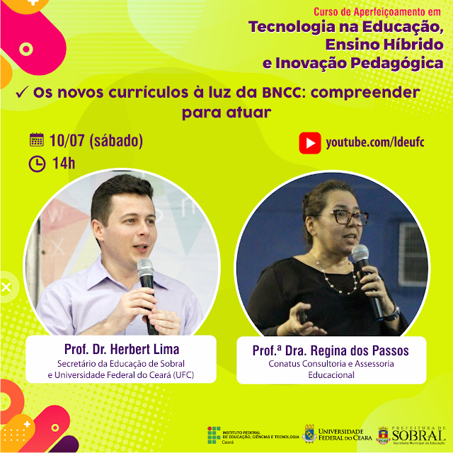 O curso “Tecnologia na Educação, Ensino Híbrido e Inovação Pedagógica” realiza, nos dias 9 e 10 de julho (sexta-feira e sábado), duas novas aulas abordando as competências necessárias à prática educativa e os novos currículos à luz da Base Nacional Comum Curricular (BNCC). A partir das 14h, as aulas são transmitidas ao vivo pelo canal do Laboratório Digital Educacional no Youtube.