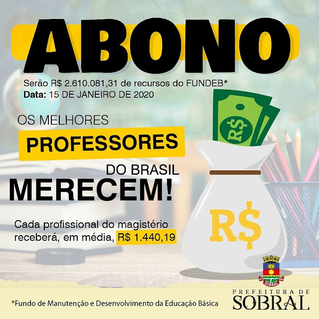 A Prefeitura de Sobral, por meio da Secretaria da Educação, depositará no próximo dia 15 de janeiro um abono salarial na conta de 1.480 profissionais do magistério (efetivos, temporários, diretores, vices e coordenadores pedagógicos). O valor total de R$ 2.610.081,31 é resultado da divisão das “sobras” dos recursos do Fundo de Manutenção e Desenvolvimento da Educação Básica e de Valorização dos Profissionais da Educação (Fundeb). Cada profissional receberá, em média, R$ 1.440,19 (valor bruto), conforme anúncio realizado, nesta terça-feira (31/12), pelo prefeito Ivo Gomes.