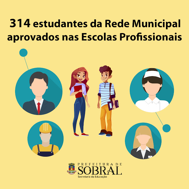 Neste ano, 314 estudantes das escolas municipais foram aprovados na seleção das três Escolas Estaduais de Educação Profissional de Sobral e farão cursos técnicos integrado ao ensino médio. Foram selecionados os estudantes com as maiores médias nas notas das disciplinas do 6º ao 9º ano do ensino fundamental. Anualmente, as escolas profissionais oferecem 520 vagas para ingresso no 1º ano do ensino médio das três escolas.