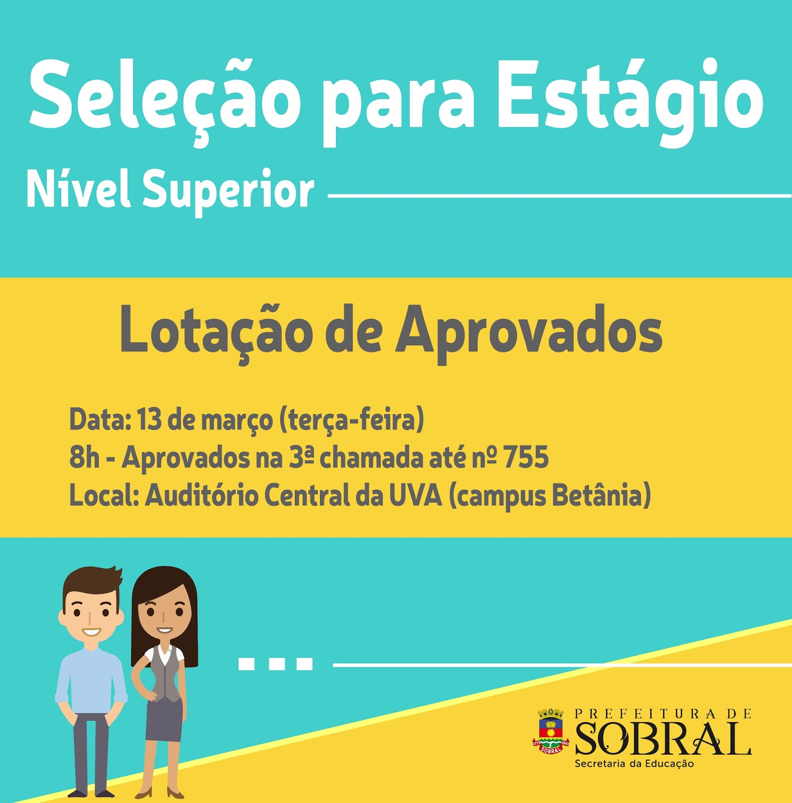 Foi divulgado o resultado final da seleção pública para estágio na Secretaria da Educação, no Diário Oficial do Município nº 261, de 09 de março de 2018. Os candidatos aprovados até a classificação de nº 755 deverão comparecer para lotação, na terça-feira (13/03), às 8h, no auditório central da Universidade Estadual Vale do Acaraú, no campus Betânia.