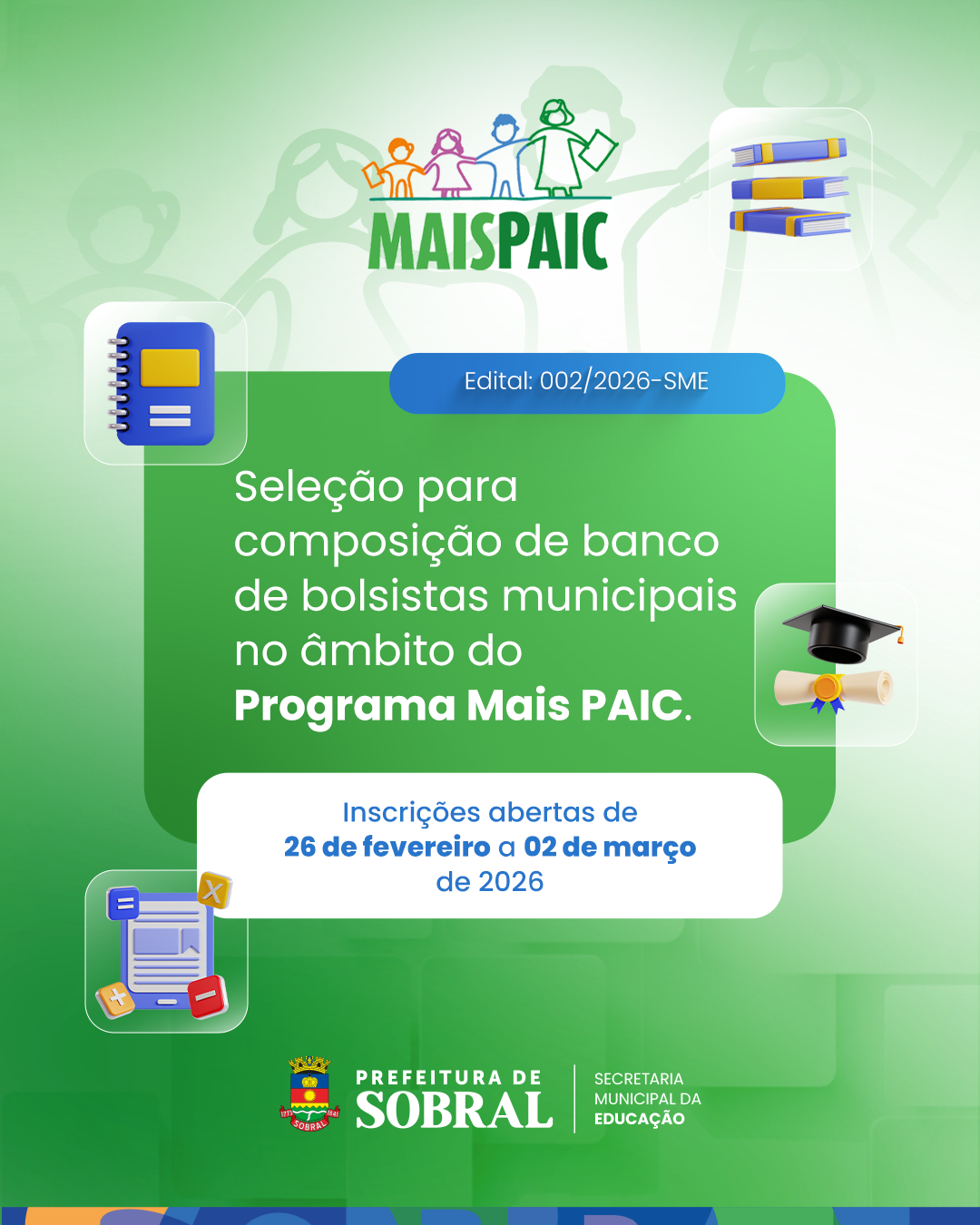 A Secretaria Municipal da Educação de Sobral lança o Edital nº 002/2026 – SME, que abre seleção pública para a composição do banco de bolsistas municipais do Programa de Aprendizagem na Idade Certa – Mais PAIC. A iniciativa tem como objetivo selecionar formador municipal para o Eixo Literatura e Formação do Leitor, fortalecendo as ações de formação continuada de professores e gestores da rede pública.