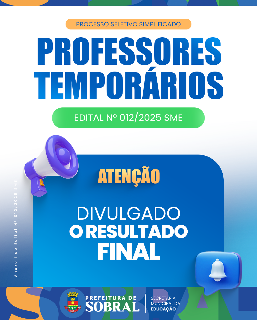 A Prefeitura de Sobral, por meio da Secretaria Municipal da Educação (SME), divulgou oresultado final do processo seletivo simplificado (Edital nº 012/2025 – SME), destinado àcomposição de banco de recursos humanos para contratação temporária de professores, a fim de