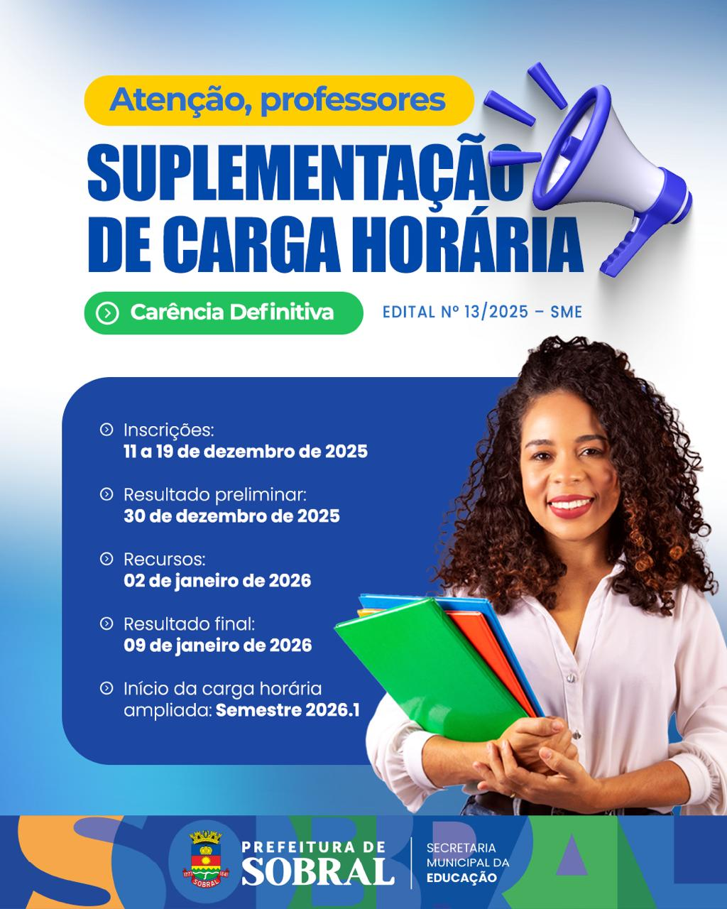 A Secretaria da Educação de Sobral publica, nesta quinta-feira (11/12), o Edital nº 013/2025, que estabelece as normas para a suplementação de carga horária (ampliação temporária) de professores da rede municipal em carência definitiva para o ano letivo de 2026. O processo tem como objetivo