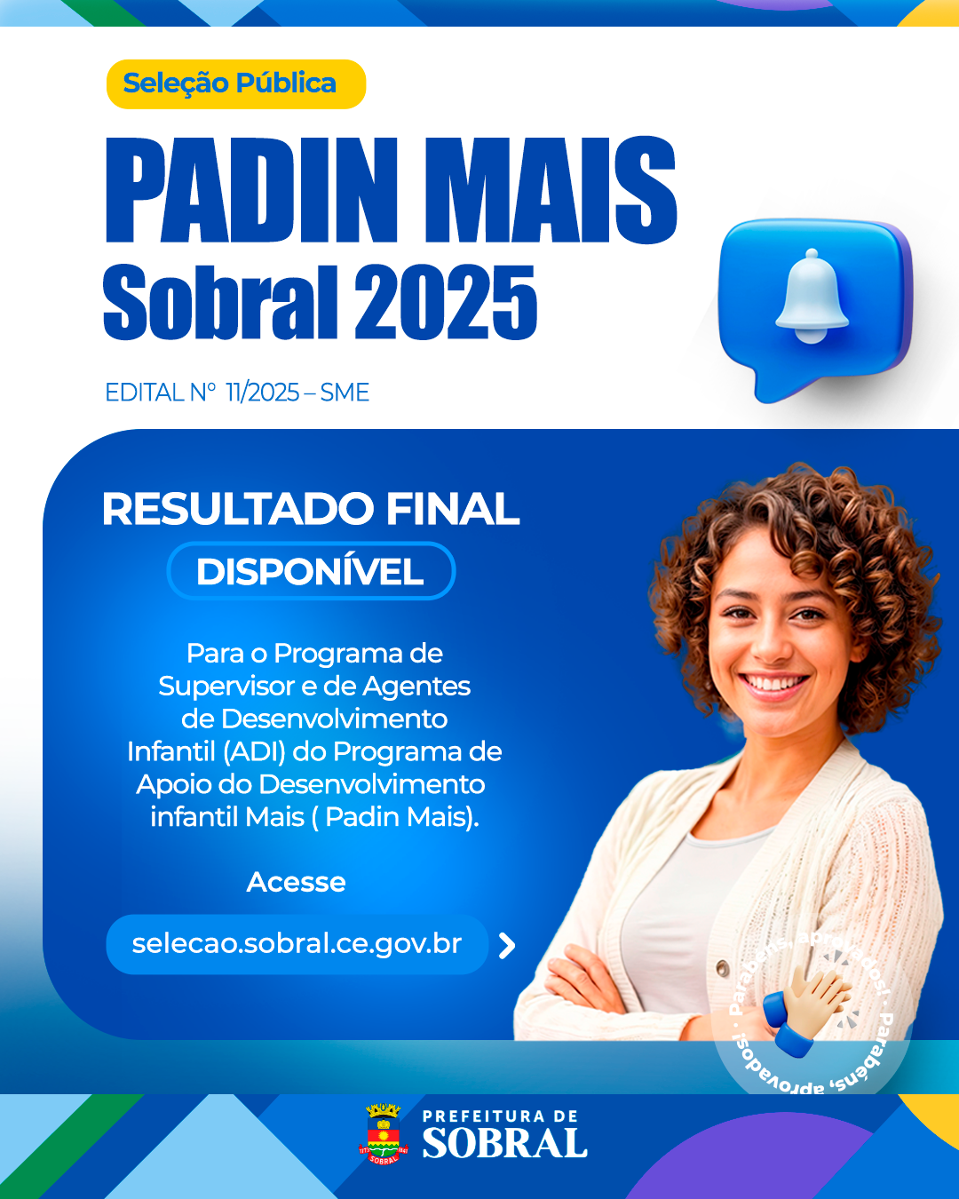 A Secretaria da Educação de Sobral, por meio da Comissão Avaliadora e Julgadora, divulgou o resultado final da seleção para o suprimento das funções de Supervisor e Agente de Desenvolvimento Infantil (ADI) do Programa de Apoio ao Desenvolvimento Infantil Mais (PADIN Mais), conforme previsto no Edital nº 011/2025 – SME.